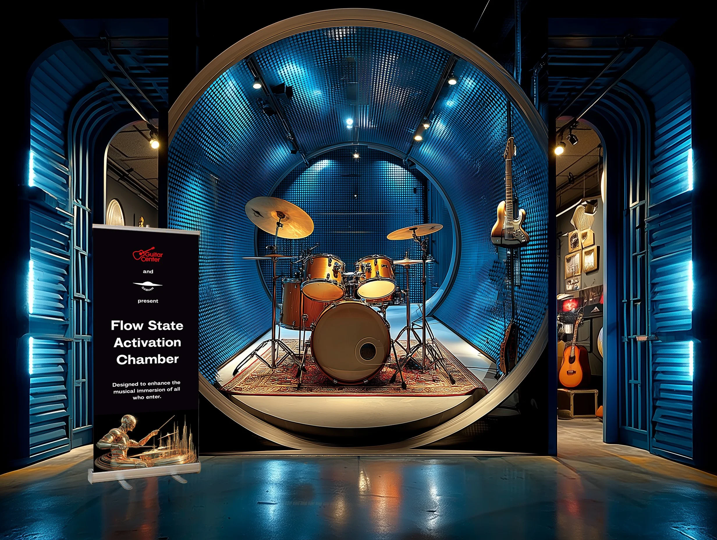 Sabian is partnering with select retailers to launch the Flow State Chamber, an immersive, soundproof room designed to put drummers in total flow. With chrome-lined acoustics, Bluetooth connectivity, and speakers in every surface, players are fully surrounded by sound while playing kits inspired by legends like Travis Barker, Phil Rudd, and Charlie Watts.